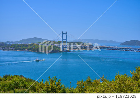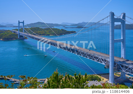 岡山県倉敷市と香川県坂出市に架かる下津井瀬戸大橋(しもついせとおおはし)を鷲羽山からの眺望