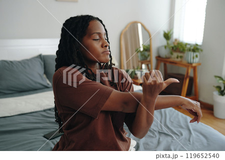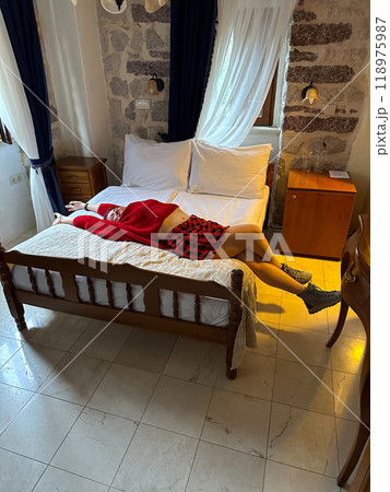 Millennial woman in a red sweater resting on a bed in a rustic bedroom with stone walls and white curtains. Moment of relaxation and comfort captured in a cozy setting in autumn. Relaxation, comfort