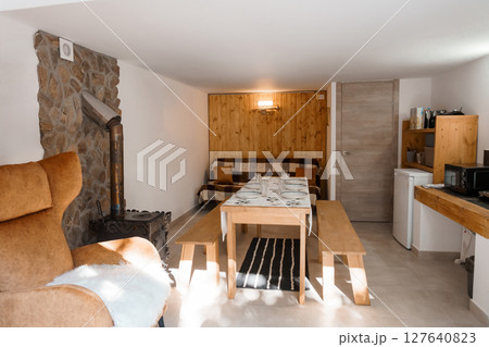 Cozy Rustic Cabin Interior with Stone Fireplace, Wood Paneling, Dining Table and Sofa. Warm Brown Tones, Natural Light, Relaxing Living Space
