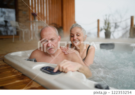 Older man setting up a hot tub, using control panel. Wellness getaway for senior couple.