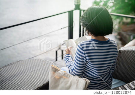 Woman sitting on chair reading a book on balcony overlooking river during golden hour morning. Self care, digital detox, and mindful slow living. Emotional wellness in riverside retreat. Quiet luxury.