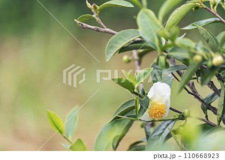 Green tea tree Flower fresh leaves in eco herbal farm. Tree tea plantations in morning sun light. Freshness herbal natural garden farmland. Drinking organic relax. Green tea tree in farm
