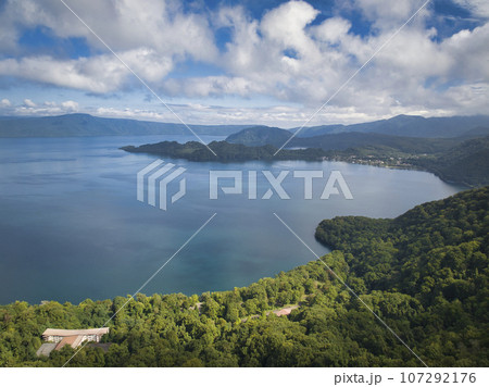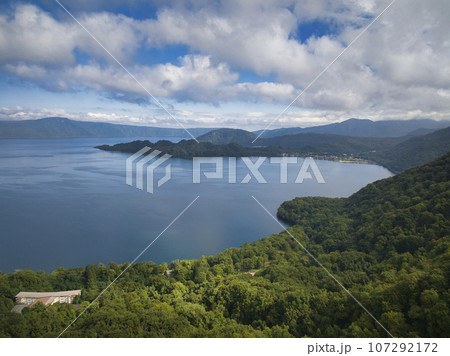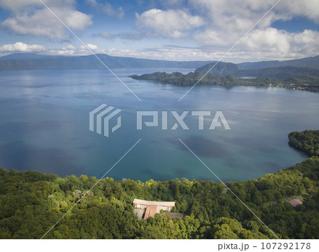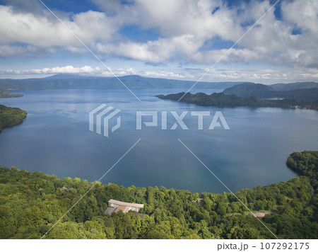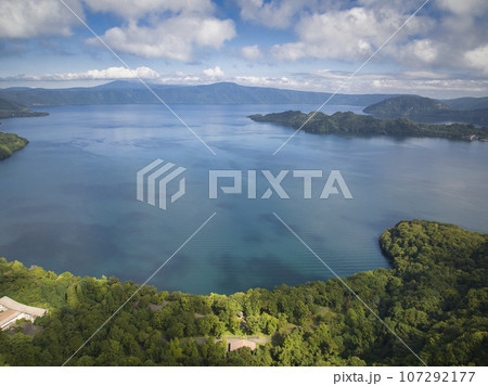 発荷峠展望台からの雄大な十和田湖の眺め(パノラマ写真) 秋田県小坂町(ドローンによる空撮)
