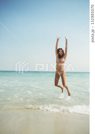 Woman jumping at sandy beach shoreline wearing floral-patterned bikini set with gentle ocean waves