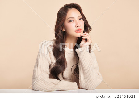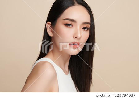 Beautiful young asian woman with clean fresh skin on beige background, Face care, Facial treatment, Cosmetology, beauty and spa, Asian women portrait.