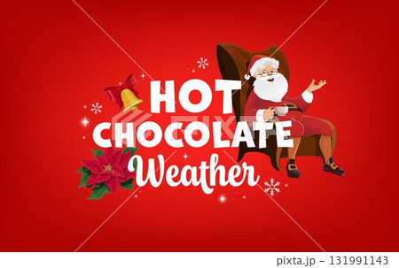Hot chocolate season quote Merry Christmas greeting card. Happy cartoon Santa Claus sit in armchair and drink hot chocolate from mug. Festive poster with Santa, poinsettia, bell and snowflakes