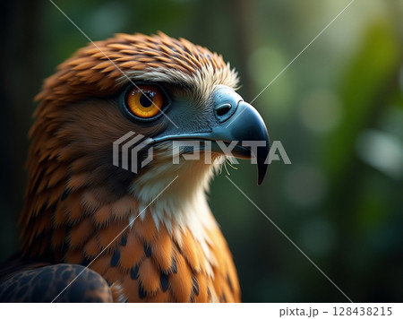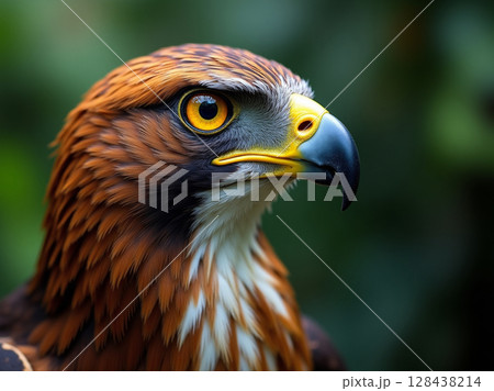 Striking Hawk Portrait with Amber Eyes Amidst Jungle Greenery