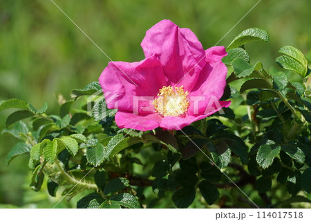 紅色のハマナスの花が咲く初夏の風景(アップ)