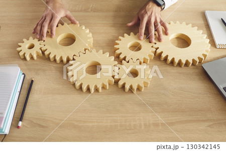 Top view of business man connecting big wooden gears together sitting at the desk on his workplace