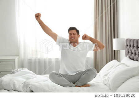 Man awakening on bed at home. Lazy morning
