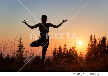 Silhouette of sporty woman doing yoga exercises at early morning. Meditation with view of mountains. Girl in gym suit practicing yoga poses.