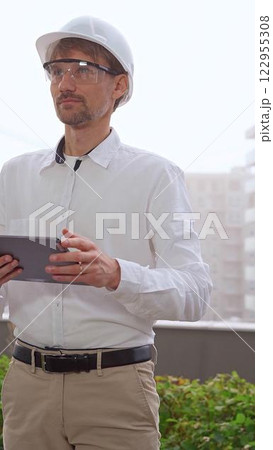 Male construction engineer or architect, wearing a white shirt and helmet, is using a digital tablet while inspecting a building site in foggy weather, front view. Architecture concept