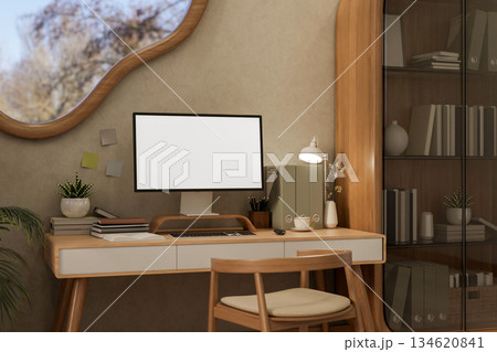 Blank screen computer on wooden table with chair under odd shape window in a living room or bedroom.