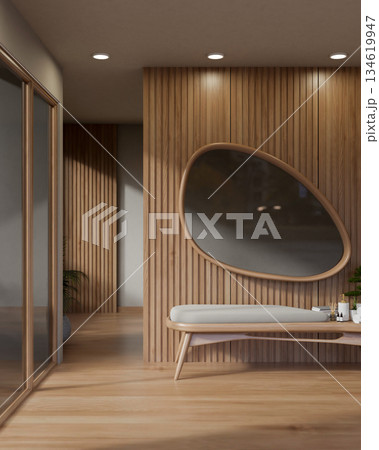 Oval shape mirror on wall over a wooden bench with towels and essentials at spa massage waiting area
