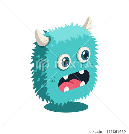 Cute blue furry monster character with big eyes and horns in funny surprised expression vector illustration