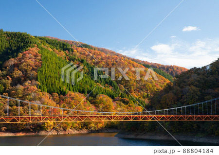 〔福井県大野市・11月〕「夢のかけはし」の秋模様 九頭竜湖の紅葉風景