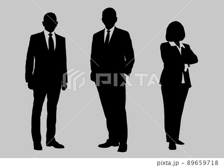 Dark gray silhouettes portrait of three businessmen posing on gray background, flat line vector and illustration.