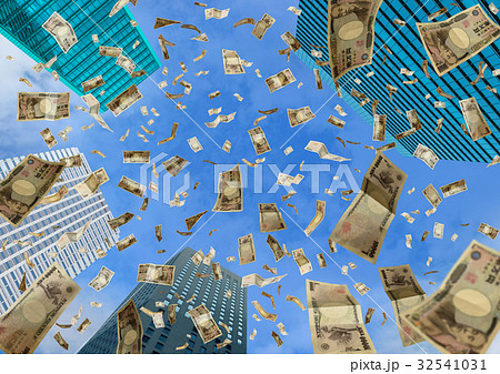 高層ビルに舞う一万円札(福沢諭吉)
