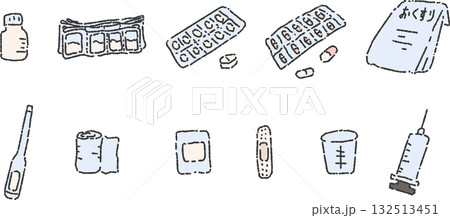 救急箱と絆創膏と包帯のシンプルなイラスト素材セット