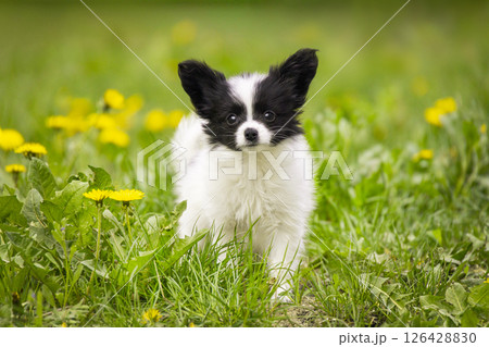 Cute Papillon Puppy Sitting in Green Grass with Dandelions