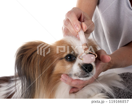 Caucasian woman combing a dog. Papillon Continental Spaniel with tongue hanging out at grooming.