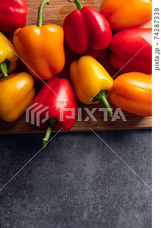 Colorful vegetables, yellow, green and red bell peppers on gray wall background