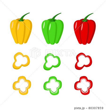 Set of Bulgarian peppers and slices. Colored sweet pepper vector illustration isolated on white.