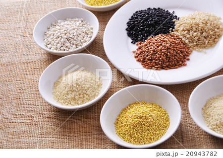 雑穀ごはん(黒米・発芽玄米、キヌア、黒豆、ごま、きび等)粗食、健康食、ダイエット食、和食のイメージ。