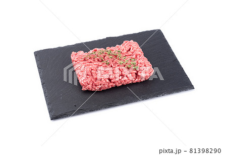 Minced meat with caraway seeds on black slate stone board isolated on white background.