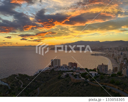 Breathtaking sunset over rugged coastal cliffs and serene ocean waves Dramatic sky in golden hues reflecting on the calm tranquil waters of the picturesque seascape Idyllic