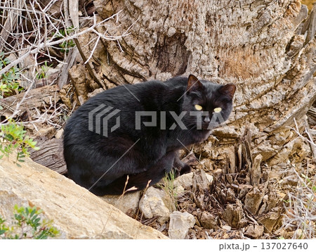 Dark feline with shining amber eyes crouches, Silent black cat among dry leaves and rugged bark
