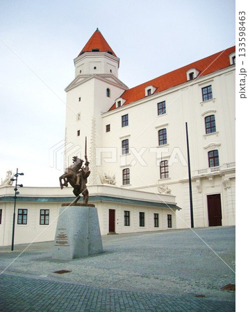 スロバキア、夕日に照らされたブラチスラヴァ城とスヴァルトプルク王の騎馬像