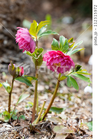 早春の庭に咲くピンク色の八重咲きクリスマスローズ