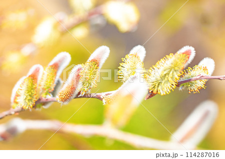 家の周りの草花 四季の色々 早春の朝日を浴びて輝くネコヤナギ