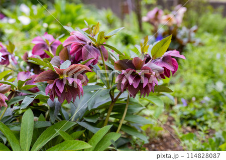 早春の庭に咲く濃い紫色のクリスマスローズ