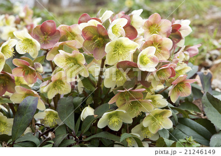 早春の庭に咲くピンク色のクリスマスローズクリスマスローズ、ヘレボルス、花、森、日陰、木漏れ日、植物、