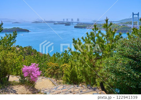 ツツジ咲く岡山県倉敷市の鷲羽山の第一展望台付近からの眺望(下津井瀬戸大橋,櫃石島橋など)
