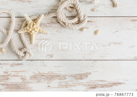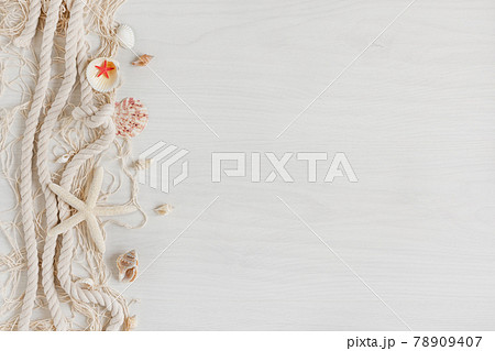 Sea background with fishing net, marine rope and seashells top view on white wooden background.