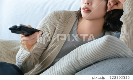 ソファでテレビを見る女性