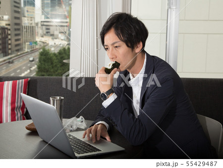 コンビニおにぎりを食べながら仕事をするビジネスマン