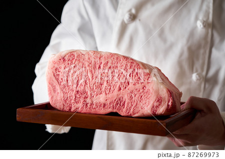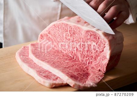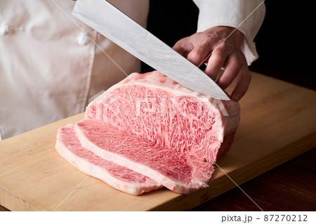 国産の黒毛和牛もも肉(シンシン)をカットする料理人