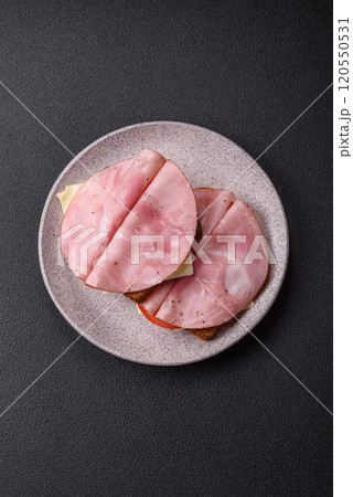 Sandwich with toast, ham, cheese, tomatoes, salt, spices and herbs