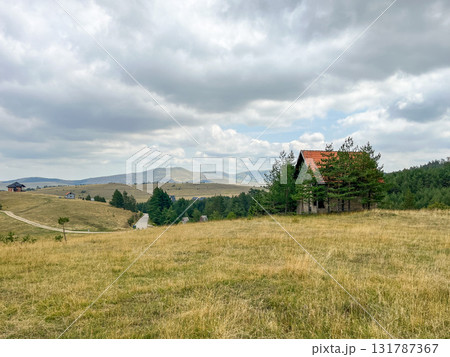Rural landscape with grassy field, lonely house, pine trees and cloudy sky in the background.