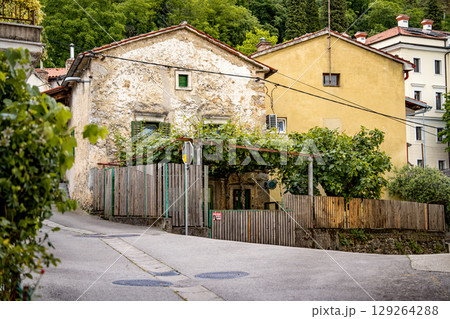 Rustic Street Scene In Vipava, Slovenia: Old Stone House With Wooden Doors And A Bench Beneath Overhanging Green Vines Along A Quiet Winding Lane In The Countryside
