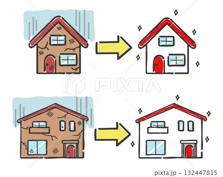 老朽化した一軒家と新築の一軒家のイラスト