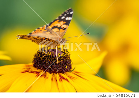 Butterfly of Vanessa cardui collecting nectar on flower. Macro yellow butterfly