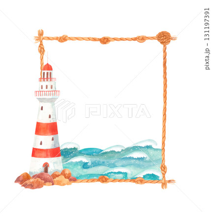 Watercolor marine rope frame with lighthouse and sea waves. Square nautical clipart border.