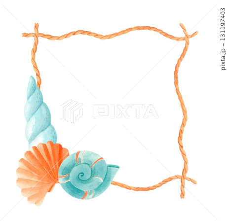 Watercolor marine rope frame with seashells. Square nautical clipart border.