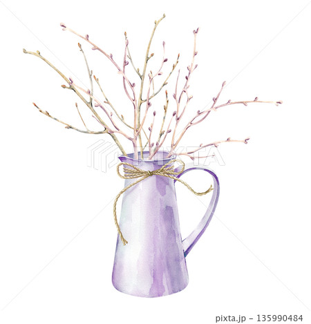 A delicate composition of a white jug tied with twine, with leafless branches. Watercolor illustration on an isolated background. A spring clipart of seasonal home decor for decorating spring themes