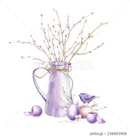 A spring composition with a bouquet of bare branches in a white jug, whole and broken colored eggs, a small bird and white flowers. Watercolor Easter illustration on an isolated background for
